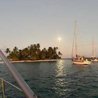 Als we wat etensresten in het water gooien zie je ze gelijk van onder de boot komen. Deze avond probeer ik met mijn manke computer de blog weer online te brengen. Er is weer heel wat de revue gepasseerd. Never a dull moment. Als het 1700 is nemen we een koelbox mee en wat bier. Op het eilandje hebben zich de andere cruisers verzameld. Even kennis maken tijdens een sundowner. Altijd gezellig.