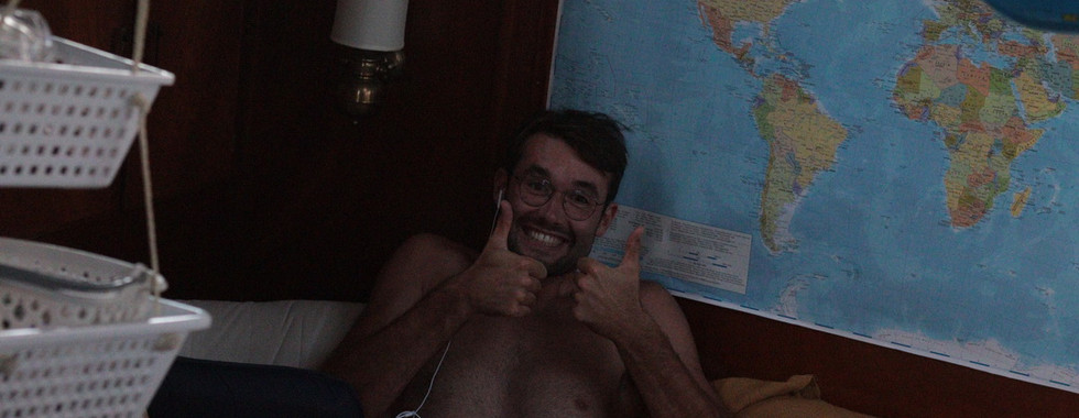 Het is 2130 en Skip zit op wacht. Hij heeft de wacht overgenomen van Monica. We doen ieder twee uurtjes achter elkaar. Per dag twee keer. We hebben een gebakken eitje gehad met het avond eten. Het brood wordt gebakken en de yoghurt staat te rijpen. Tijd voor de nacht. En hopelijk een goede rust met niet al te veel rollen. Ik zit deze blog weer aan te vullen maar neem even pauze. Boven is het pikkedonker. Het is bewolkt en heeft vanmorgen en ook vanavond even een beetje geregend. Geen maan en geen sterren. De zee is wel vol met bioluminescentie micro-organismen. Het is alsof we door het heelal voortrazen met 7 knopen snelheid op alleen een genua en bazaanzeil. En dan gebeurt het! Dolfijnen! We horen ze eerst alleen. Dan zien we ze als witte pijlstrepen door het water scheren. Alleen de bioluminescentie micro-organismen verraden hun aanwezigheid. Magisch!