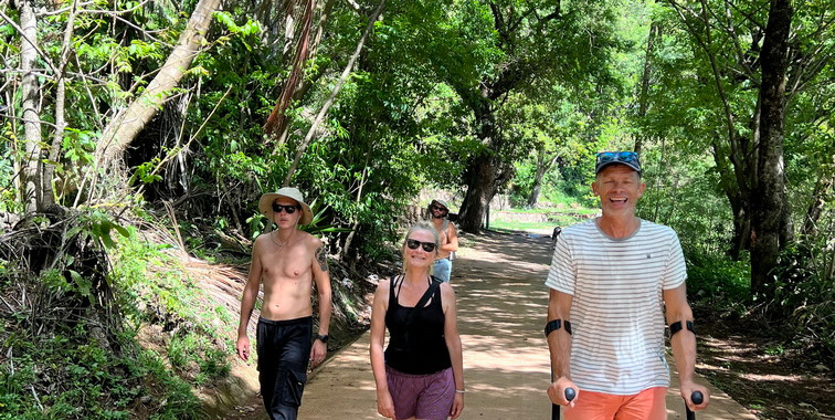 Zo vervelend op dit moment. Al 1.5 dag slik ik diclofenac met paracetamol. De zwelling wil alleen nog niet echt minder worden. De vader van de Noorse Helen is kniespecialist. Hij heeft aangegeven dat ik de juiste dosis neem en gewoon rust moet nemen. Rust ja. Net nu we het eiland willen verkennen. Maar we hebben krukken aan boord meegenomen. Dat wordt dus het eiland rondhuppelen op krukken😊Ook Rinus heeft weer de nodige goede advies gegeven. Komt goed. Om 13:00 gaan we in twee ritjes met de dinghy naar de wal. De Iles de Salut zijn voormalige gevangenis eilanden van de Fransen vanaf rond 1892. Het bestaat uit Ile Royale, Devils island en Ile Josphe. Er is dus heel wat gebeurd hier. Er is veel leven, aapjes, ginnypig en vogels. Ook vinden we overal mango’s, hoopjes mango’s. De meeste moeten nog wat doorrijpen. Mooi in onze netten. We lopen het hele eiland rond in een uurtje. Ik op mijn krukken. Het gaat prima. Aan de andere kant vinden we ook de kokosnoten. Met een groot mes pellen we ze en drinken de melk en eten het vruchtvlees. Een tropisch paradijs. Op de terugweg komen we in de dinghy een Franse solozeiler Niel tegen. Hij wordt gelijk uitgenodigd aan boord voor het eten tezamen met de bemanning van Nordlys.
