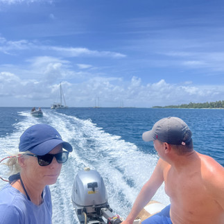 Om 1400 komt Kurt me ophalen om mee te eten op Intotheblue. Lekker pasta. Zo fijn dat ik mag mee eten. Ik ben best moe want vanmorgen ook weer vroeg wakker om 0500. Het slapen gaat echt slecht. Kon ik maar eens uitslapen, pfff. Na eten gaan we met de dinghy even op de motu kijken. Er staat een klein hutje. Heel veel heremietkreeften.