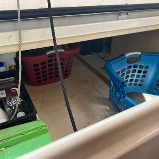 De reserve vast schroef verplaats ik naar de voor opslag aan dek. Daar moet dan ook eerst alles weer uit want die schroef moet zover mogelijk voorin weg geborgen worden. Die hoop ik nooit nodig te hebben. De bakboord kuip opslag ruim ik op omdat daar de duikcompressor in moet komen. Wat half volle flessen schoonmaak giet ik over. Alle meerlijnen die er nog lagen verplaats ik ook naar de voor opslag luiken. Ik denk dat de duikcompressor er wel gaat passen. Die komt hopelijk einde van de maand. Een mooi verjaardagscadeau zullen we maar zeggen. Ik probeer wat overtollige lijm van de dinghy plakken weg te krabben en vegen.