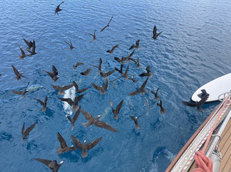 Het stikt hier op de ankerplaats van de scholen met kleine jonge visjes. Daar wordt door de tonijnen net onder het wateroppervlak op gejaagd. Je ziet ze versnellen. Hierdoor hangen er ook grote weer grote groepen sternen boven. Die proberen mee te liften op de visjes die de tonijnen proberen te ontsnappen.