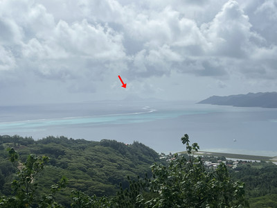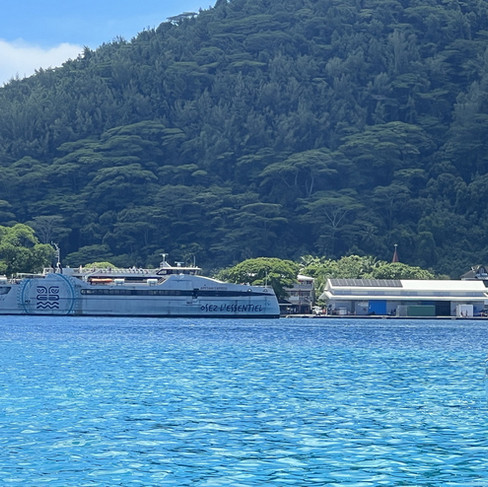Aan de andere kant is Bora Bora net te zien in de wolken. Niet echt helder zicht vandaag. Als we om 1530 terug zijn in het dorp nemen we een biertje op het terras. De passagiers van de cruiseboot haasten zich aan boord. Nou ja meer strompelend. Wat zien die mensen er toch slecht uit. Om 1630 ontmeert het schip. Wij varen er in de dinghy vlak voor langs en zwaaien ze uit.