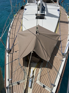 Daarna maak ik een begin met de regen canvas boven het voorste luik. Het plan is een afdak te maken zodat ook tijdens regen het luik open kan blijven. Zo waait het beter door in de boot en is het minder benauwd. Ik heb net genoeg Sunbrella om deze te maken. Nog wat stukken over maar bij een volgende gelegenheid moet ik wat meters kopen.