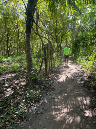 Achter de resorts langs lopen we door het bos en langs de mangroven. We komen langs een veld met papaja, kokos, Yuka, mango, bananenbomen en mais planten. Hier kunnen we verse papaja’s krijgen denk ik. Ik spreek de boer aan die in zijn hangmat onder een boom in de schaduw ligt te wachten tot zijn fruit rijpt. Kunnen we een paar papaja’s van u kopen? Maar natuurlijk! We lopen samen de boomgaard in en hij verteld welke rijp zijn en welke nog wel 8 dagen nodig hebben om te rijpen. Die willen we graag! Ik krijg drie papaja’s zo groot als een vollybal.