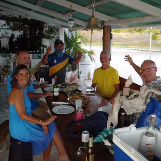 De mannen hebben echt hun best gedaan. Verse gebakken vis, conch salade. Lekkere verse broodjes, schelpen als oesters en gebakken gepaneerde conch. Drank hadden ze niet dus dat hebben we zelf meegenomen. Een idyllisch plekje. Een mooie ervaring. Om 2130 brengen ze ons terug aan boord. Het was weer een mooie dag. Moe en voldaan ga ik slapen.