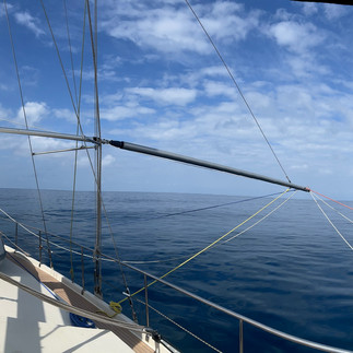 Vandaag een nieuw afstandsrecord. 180 mijl in 25 uur is 7.3 kn gemiddeld. Kan zeker nog wel een tandje sneller. Dat verwachten we in de komende dagen. Om 1330 ga ik even liggen. Eerst wat lezen want slapen wil nog steeds niet lukken in de middag. Ethan probeert van alles om wat rustiger in de deining te liggen. Wil niet lukken. Het gevolg is dat ik niet in slaap kom van alle winch handelingen. Om 1600 geef ik het op en stap uit mijn kooi. De wind is iets gedraaid maar nog steeds 10 á 12 kn. We besluiten om de ballooner erbij te zetten. Aan de horizon zien we wel aardig wat donkere wolken ontstaan. Dat voorspelt niet veel goed. Toch ff een uurtje de ballooner erop, tot het donker wordt. Deze keer zetten we de ballooner aan bakboord kant. Dat heb ik eigenlijk nog nooit gedaan. Altijd aan stuurboord kant gezet. We gooien wat blokken en schoten om. Zetten de passaat bomen en daarna de ballooner. We liggen gelijk een stuk rustiger en minder te rollen.