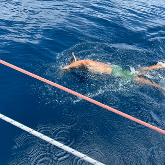 Eieren, platanen en warme broodjes. Om 1100 zetten we de motor af. Dan maar even zwemmen. Een diepblauwe oceaan waar de zonnestralen de diepte in verdwijnen. Het onderwaterschip ziet er goed uit. Geen aangroei. Even het snelheidsradartje schoonvegen.