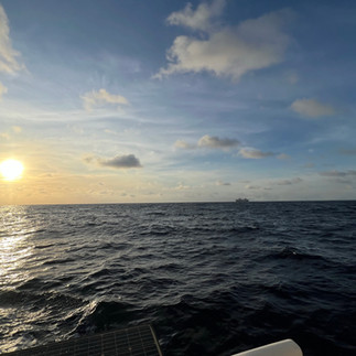 We maken er een Romana salade bij. Die moet vandaag op. Een koningsmaal. De wind begint te draaien en af te nemen. Tijd om de ballooner erbij te zetten. Eerst de passaat bomen optuigen. Voor het lapje draaien en dan de ballooner erbij. Er staat aardig wat cross swell. We rollen behoorlijk. Als ik een douch genomen heb ga ik om drie uur een tukkie proberen te doen. Dat wil niet erg lukken. Om 1600 stap ik er weer uit want we liggen volgens mij meer te rollen dan we vooruitgaan. De ballooner heeft niet veel effect bij zo weinig wind en zoveel deining. Ook is de koers veel te westelijk. We moeten eerst nog wat verder naar het zuiden. Beter halve wind over stuurboord. Dat lijkt een goede beslissing. Abayomi loopt al snel weer 7 tot 7.5 kn. Tijd voor een sundowner met toastjes. Camembert, cream cheese en blauwe kaas in de aanbieding. Om 1830 heeft Ethan een vis aan de haak. Een heel, heel klein blauwvin tonijntje. Die moet nog groeien en mag verder zwemmen. De zon gaat onder en dag 8 is alweer voorbij. De tijd gaat zo hard. Op de Atlantic crossing was het nu nog maar 4 dagen voor we in Frans-Guyana aankwamen. Dat ging echt veel te snel. Nu hebben we nog 3000 mijl te gaan. Als het meezit nog 17 dagen. Ach, dat is ook zo voorbij. Ik zie er in ieder geval helemaal niet tegen op. Integendeel zelfs. Ik heb er lang naar uit gekeken. Halverwege mijn wacht neemt de wind weer toe. Erg vlagerig. Soms tot 18 kn. Ik neem wat genua in. We lopen nog steeds ruim 7 knopen, soms over de 8 zelfs. Wel beginnen we wat meer te stampen. Niet comfortabel voor ons en niet fijn voor Abayomi. Ik bestudeer de weerkaarten en kom tot de conclusie dat we wel wat kunnen afvallen. De wind komt nu meer uit het Zuidoosten. Later weer meer uit het Oosten. Dan kunnen we wel weer wat zuidelijker sturen. Nu even naar 240. Zo lopen we lekkerder door de deining en golven. Comfortabeler en harder. Ethan was met John een weddenschap aangegaan. Binnen 28 dagen krijgen wij een fles Gin. Meer dan 28 dagen krijgt John er een. Hij ziet de bui al hangen Vanmiddag appte hij dat we te hard gaan. Ja ja zoals het er nu uit ziet zijn we er in 25 of 26 dagen. Misschien wel sneller. We gaan het zien. Er is nog een lange weg te gaan. Tijd om Ethan te porren. Ik ga proberen te slapen. Ik heb de boot zo getuned dat dat zou moeten lukken.