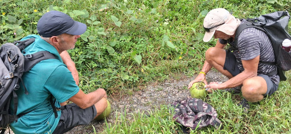Aan de overkant zit de Polynesiër André die ons alle verschillende soorten fruit laat zien en proeven die hij verbouwt in de plantage, Heerlijk. We krijgen een verse kokosnoot, een tros bananen, limoenen en papaja mee.