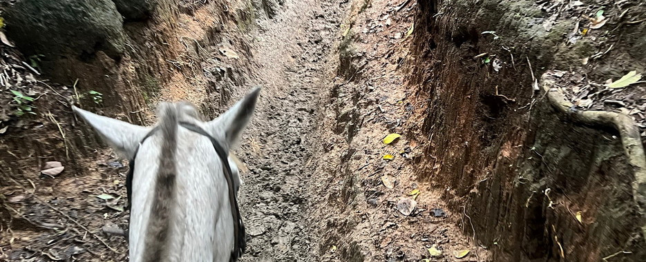 Halverwege de route barst ook de hemel weer open. Gelukkig heb ik mijn waterdichte rugzak (online gekocht in de USA toen ik in Curaçao lag) bij me. Daar kunnen we alle telefoons en waardevolle spullen goed in droog houden. De paarden hebben er zin in. Als het even vlak is draven en galopperen we erop los. Nou ja ik dan. Soms trek ik de andere twee erin mee😂😂 Oeps dat is misschien iets te veel. Het is 20 jaar geleden dat ik in Zwitserland op de boerderij van Andrea en Birgit heb leren paardrijden. Dat komt nu goed van pas en valt echt mee. Beetje onstabiel soms als ik in galop ben maar mijn paard lijkt er zin in te hebben. Hij voelt zich blijkbaar ook happy met beide oren vooruit. Af en toe een achterom om te luisteren wat voor vreemde taal aanwijzingen er van zijn rug komen. Een geweldige ervaring. Voor nog geen 15 Euro. Ik had er niet aan moeten denken dat we door deze modderpoel drie uur terug hadden moeten ploeteren in de stromende regen. De paarden hebben er ogenschijnlijk geen moeite mee en gedragen zich sterk en verzekerd. Na een uurtje rijden, door een prachtig landschap, soms in draf, soms in galop en soms wandelend en klimmend over grote rotsblokken komen we aan op ons begin punt. Aangezien de meeste toeristen via de wandelroutes teruggaan hebben we die gelukkig ook amper gezien. Fantastisch! Een minibus terug naar de poort en de stadsbus zet ons af voor het hotel. We zijn doorweekt van de tropische regenbuien maar zeer voldaan van deze bijzondere dag. Ook zo blij dat ik twee weken geleden nieuwe bergschoenen had gekocht. Al hoewel ze doorweekt zijn van de regen zijn ze me goed bevallen, zijn ze sterk en geven veel steun.