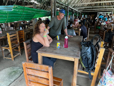 Na een rustige nacht worden we wakker en nemen eerst een duik in de zee. Dan ons ontbijtje op het strand. We hebben de hele ochtend filosofische gesprekken over de wereldeconomie, de klimaat transitie en de machten. Waarom maken mensen het zo ingewikkeld in de wereld. Waarom is er zoveel machtsstrijd. Rick heeft daar alle antwoorden op. Eric en Karien begrijpen het echt niet. We maken plannen voor de komende dagen en die veranderen elk uur. De mogelijkheden zijn zo groot. We moeten een keuze maken. We boeken uiteindelijk ons volgende hotelletje in de buurt van Tayrona. Een van de grootste en bekendste natuurparken in Colombia. Deze middag gaan we nog even de omgeving verkennen. We worden door Jeimen met zijn Tuk Tuk (250 cc, ja zeker!) naar de banden specialist gebracht. Langs de grote weg. Het is het bureautje voor de rivier toertjes. In Spaans legt de man uit wat voor tocht we gaan maken. Een half uurtje lopen over hele vlakke weggetjes door de jungle voor we bij de rivier aankomen. Daar mogen we op de binnenbanden de rivier afzakken. Op de brommertaxi rijden we de stad uit via een zandweg vol met gaten, keien en half ondergelopen.
