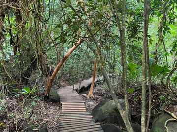 Als hij soepeltjes het paard in beweging zet blijkt hij echter een hele andere route te gaan nemen die onbegaanbaar is voor wandelaars. We worden uit elkaar gedreven. Snel kan ik hem nog wat aanwijzingen toeroepen. Hij heeft nog nooit op een paard gezeten. Later zal blijken dat hij snel moest leren want een eenvoudig rondje Beekse Bergen was het niet 😂Karien en ik nemen de wandelroute. Het begin is netjes aangelegd met vlonders. Echt een jungle tocht waar we veel wild gaan zien zal het niet worden. Veel te veel toeristen. Het is een mooie wandeling door jungle en langs mangroven.