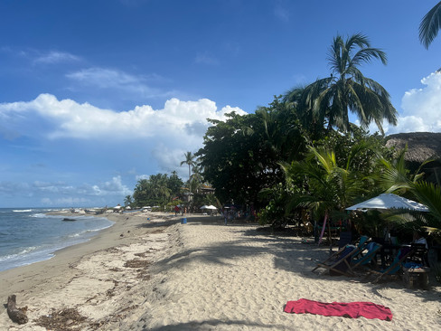 Een ontbijtje aan het strand. We pakken in en gaan met de Tuk Tuk vol bepakt naar Palomino om de bus naar Tayrona te nemen. Onderweg zien we vele bananenplantages. Chiquita bananen. Allemaal voor de export! Hier groeien de bananen van Albert Hein.